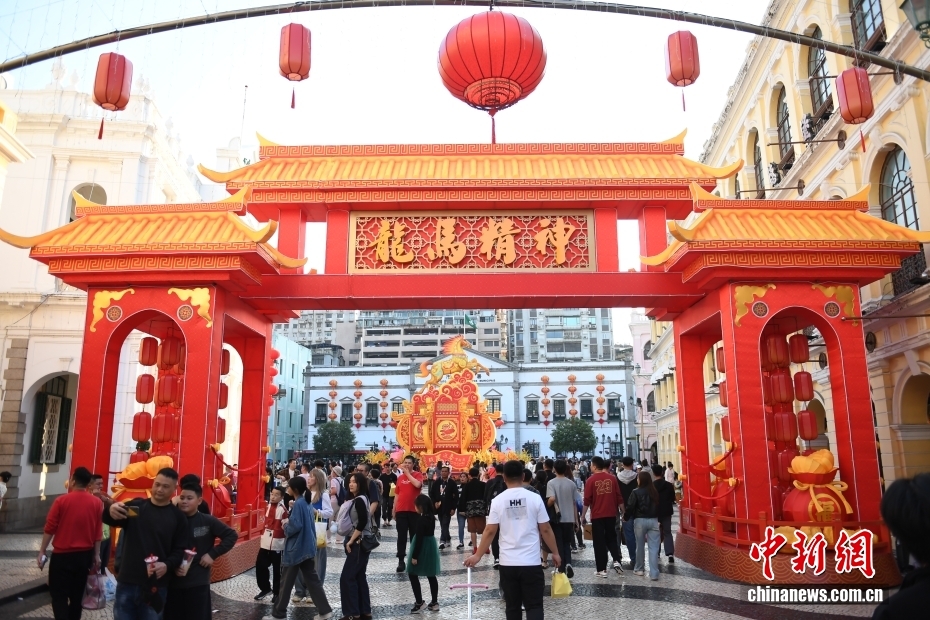 2月13日,随着农历马年新春临近,澳门多地加装骏马主题装饰,市面氛围热闹喜庆,以骏马奔腾之姿迎接新春。图为澳门大三巴牌坊前游人如织,一侧的花丛中加装了新春装饰。中新社记者 郑嘉伟 摄pagebreak