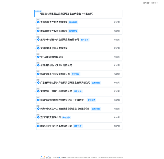 记者3月3日从公开渠道查阅获悉,粤港澳大湾区创业投资引导基金合伙企业(有限合伙)(简称“粤港澳基金”)已完成工商变更登记及私募投资基金备案登记,正式进入合规运作阶段。