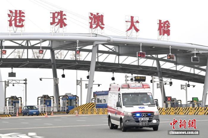 3月27日,香港特区政府公布“大湾区跨境直通救护车试行计划”即日起正式与深圳、珠海和澳门实施双向转运安排。图为日前参与双向转运演练的澳门跨境救护车经港珠澳大桥前往澳门仁伯爵综合医院。